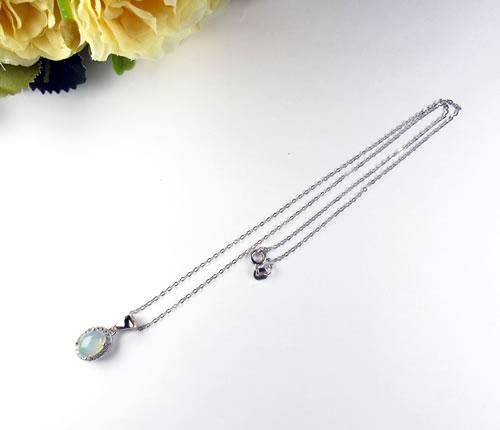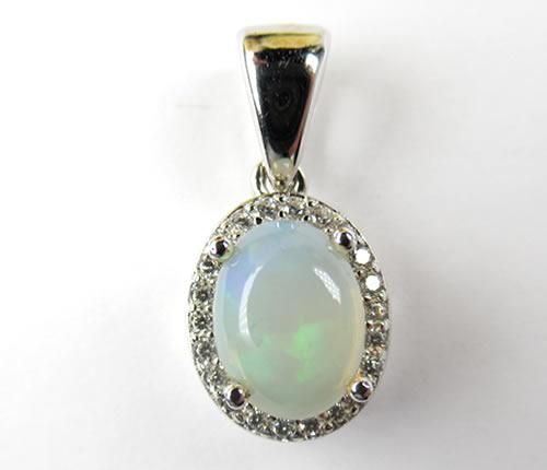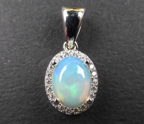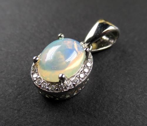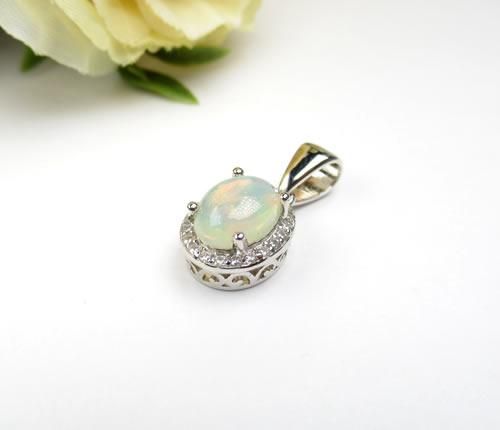 エチオピア産ファイヤーオパール8x6ミリ キュービックジルコニアペンダント14Kホワイトゴールドメッキ シルバー925 ジュエリー j-opal003